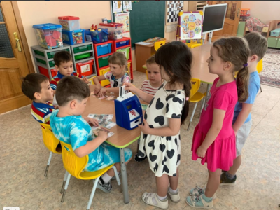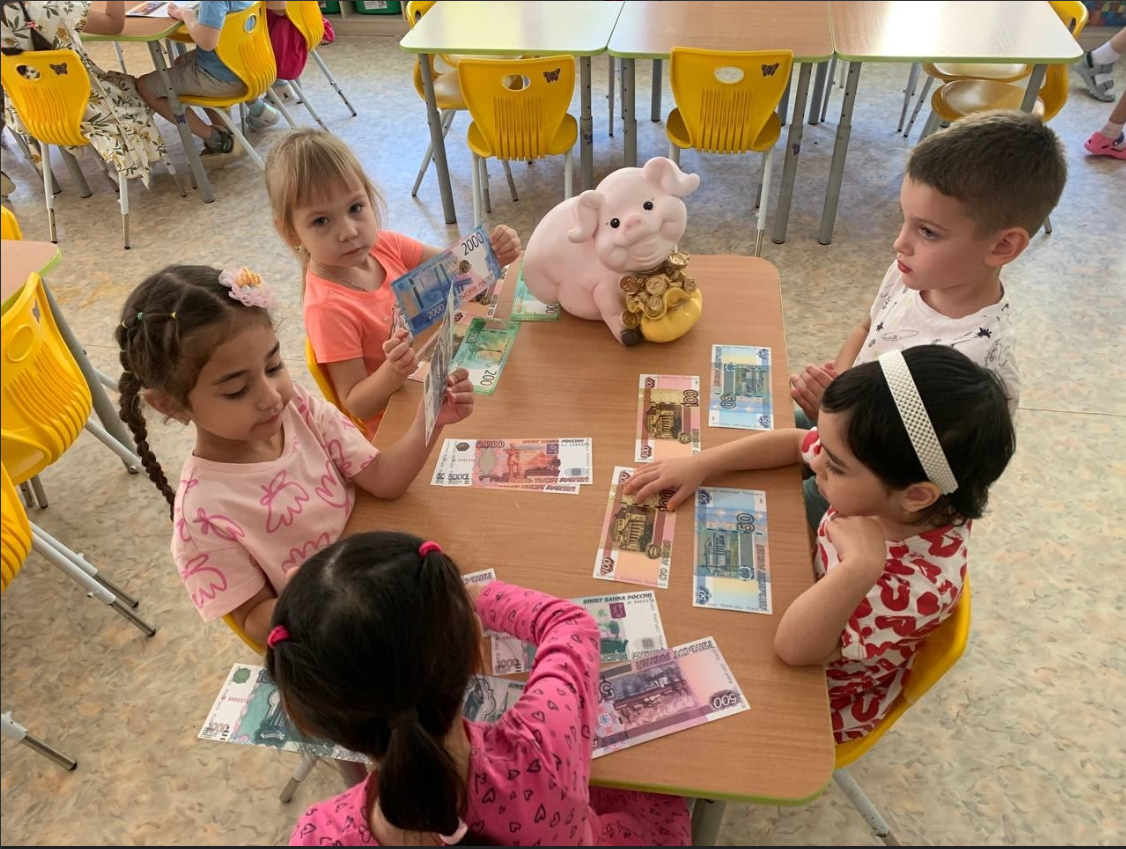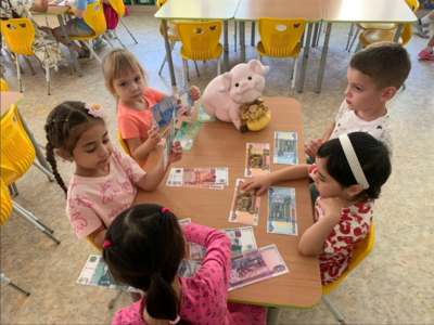 В группах прошли тематические занятия «Потерял деньги- что делать», организованны дидактические игры: «Где можно хранить деньги», «Советы покупателю», «Кафе «Вкусно и полезно», беседы «Что такое деньги?», «Где их взять?» и «Зачем нужны деньги?». Познакомили детей с понятием «Копилка».